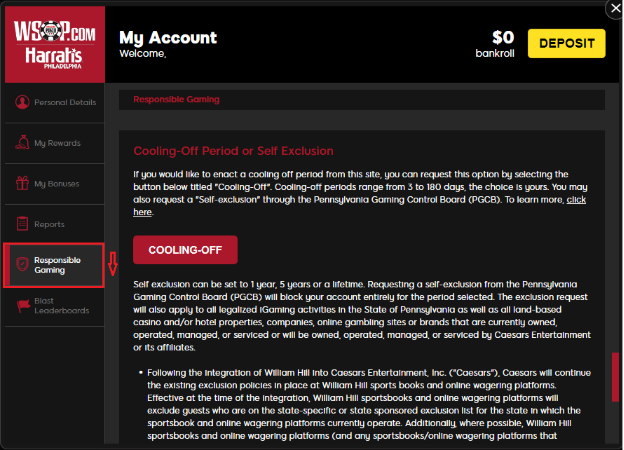- Go to the Responsible Gaming tab
