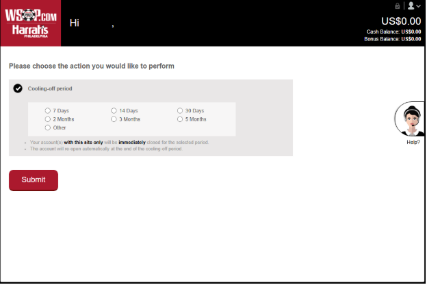 You can request to activate a “Cooling-Off” period at WSOPonline.com to temporarily take a break from real money gaming for: